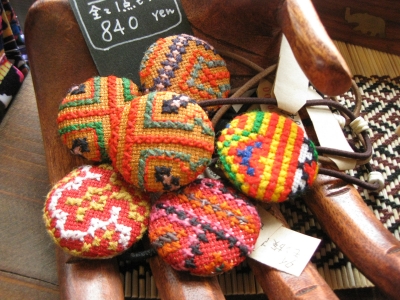 今回はその、刺繍の古布で作られたクルミボタンのヘアゴムが入荷しました。