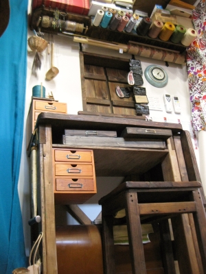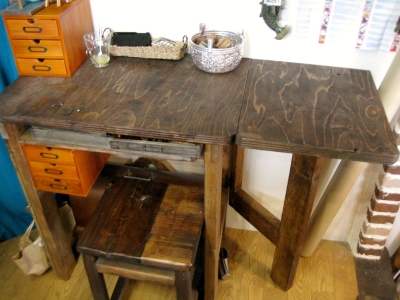 下にはお気に入りの黒いミシンが、キャスター付きの台に乗ってピッタリ収納されてます。