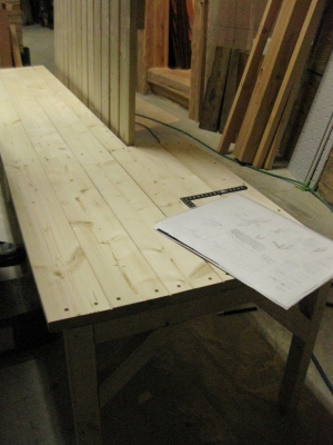 台の上には設計図のようなもの。