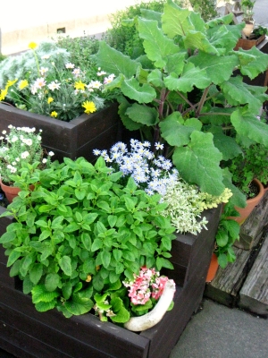 去年ひょろひょろだったレモンバーム(一番手前)は茂ってきまして