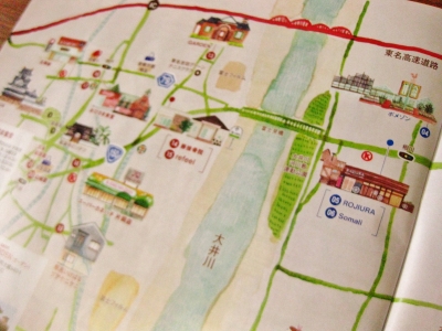 散策マップのページが可愛らしい絵になっていて、SomaliとROJURAの建物も