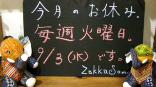 今月の休業日9月のおやすみ こんにちわ。 本日2回目の更新です。 9月のおやすみ 9月に入ってすぐ、3日の水曜日がお休みになります。 その他は通常通り火曜定休のみです。 2日(火)・3日(水)は仕入れのためのお休みになります。 秋冬の雑貨や衣料をたくさん仕入れてき... 2014.08.23今月の休業日