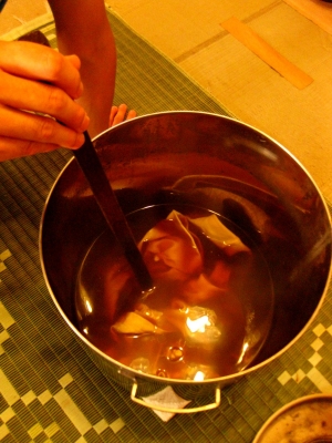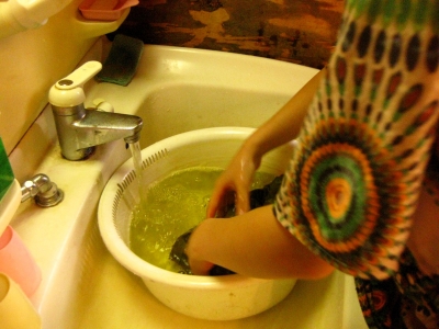 乾燥させたマリーゴールドを煮出した液にジャブジャブ。