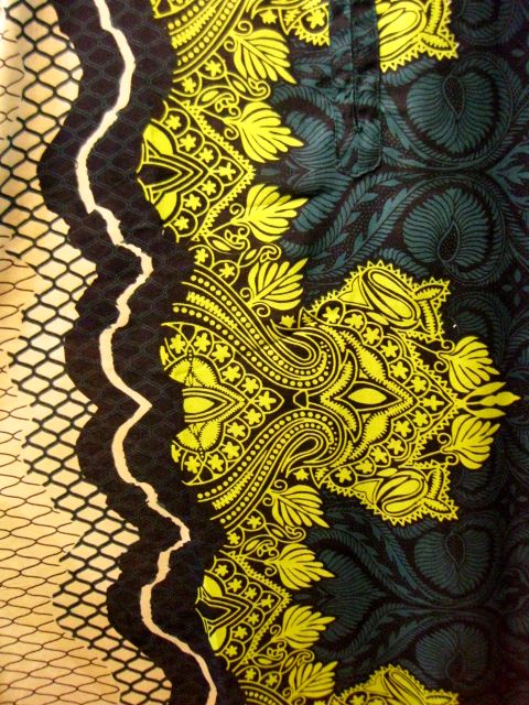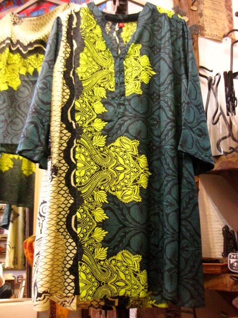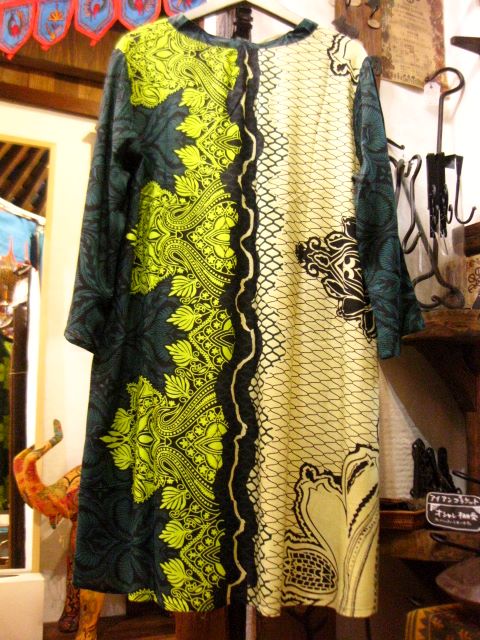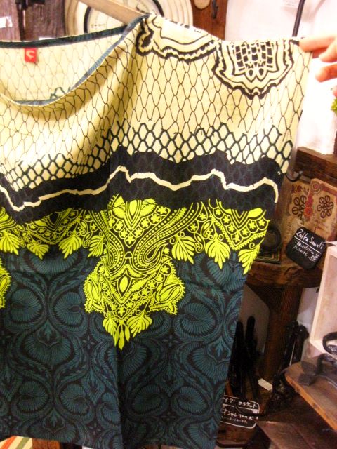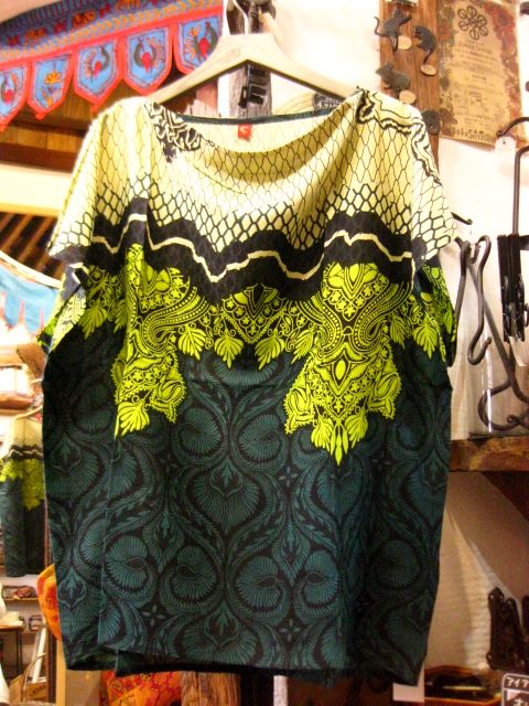 深い緑と黄緑のコントラストが鮮やかなエスニックトップスです。