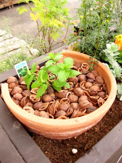 台風のときに割れてしまった素焼きの鉢を囲いにしました。