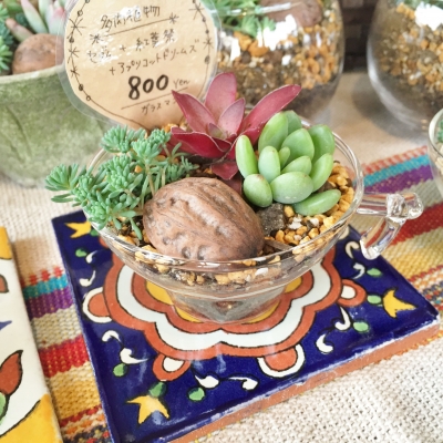 ガラスのマグカップに入った寄せ植え。