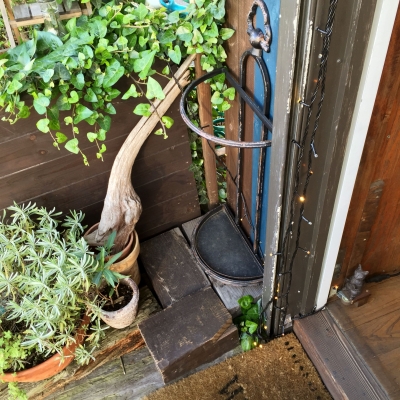 入口の傘立ての下から、アイビーがもしゃっ。