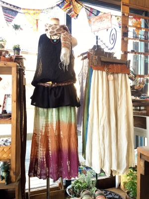 ベルトとタイダイのグラデーションスカートでコーディネートされた