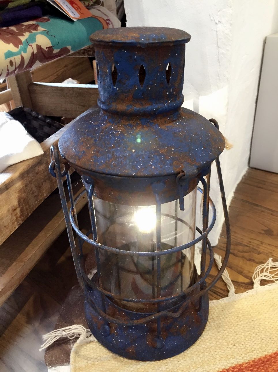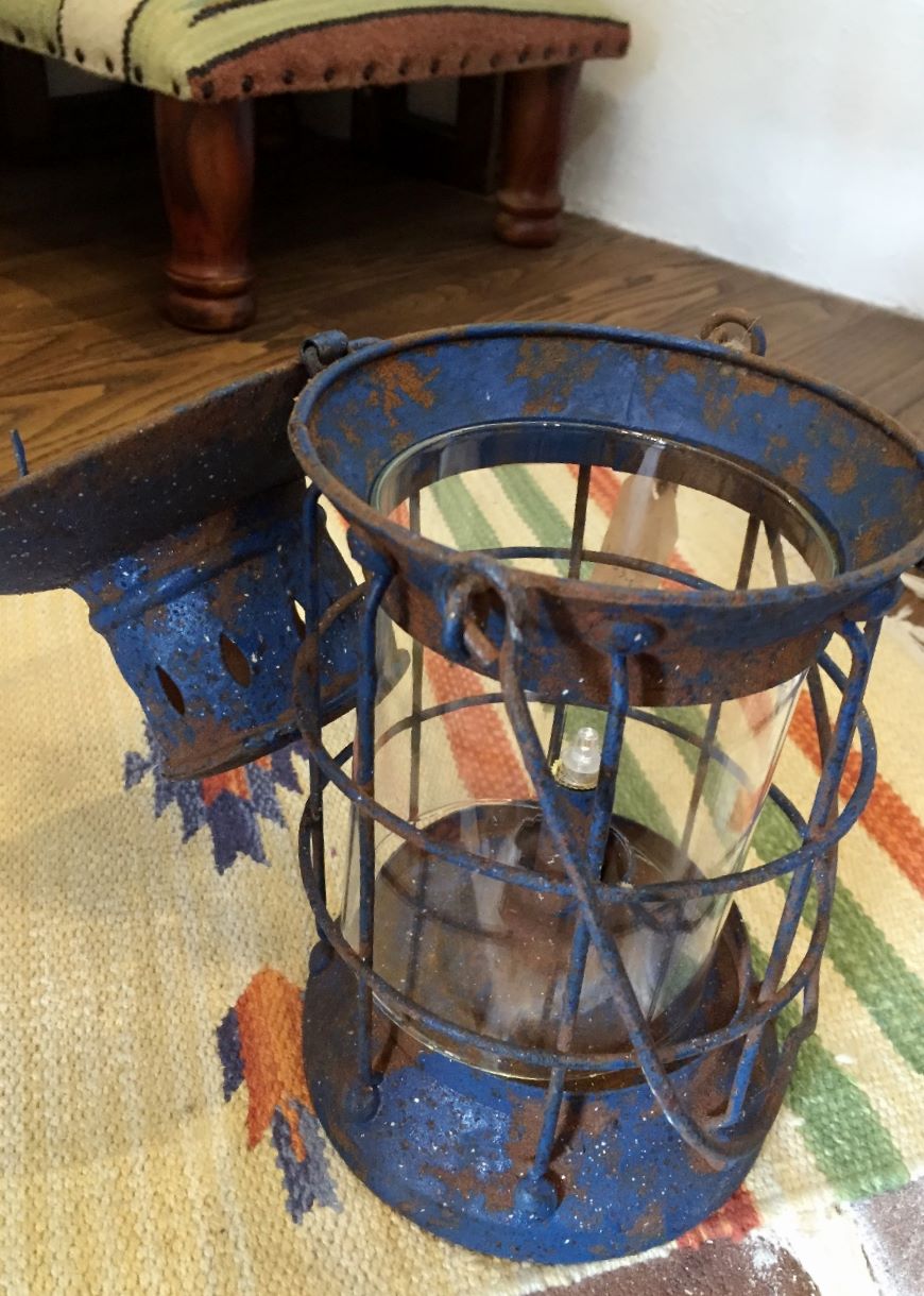 ブルーのエイジング塗装が施されたLEDのランタン。