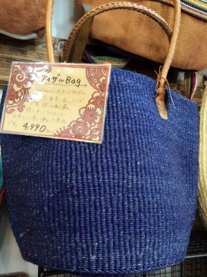 サイザル麻、渋め紺青のバッグ。