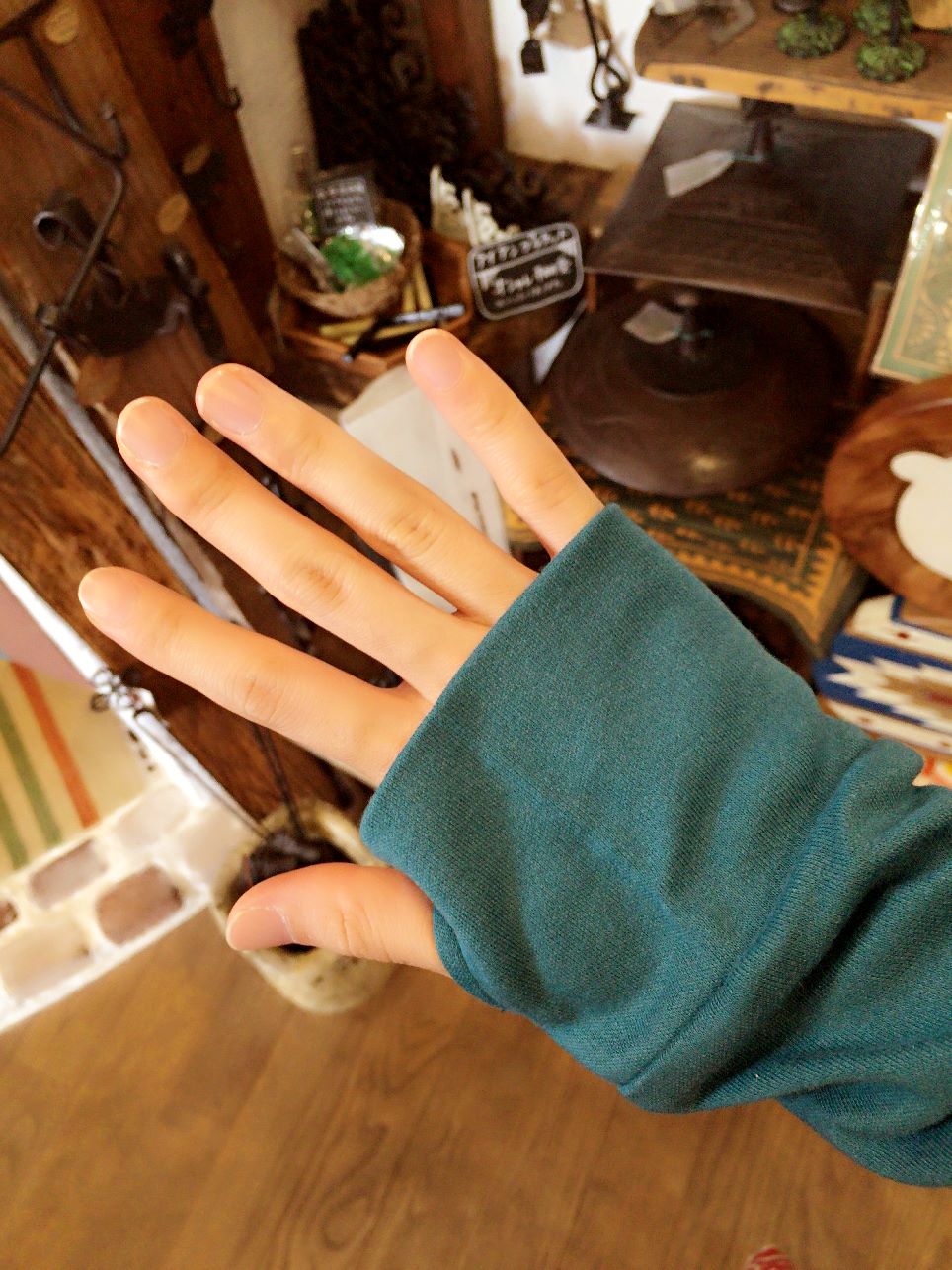 袖が手の甲までくるので長めです。