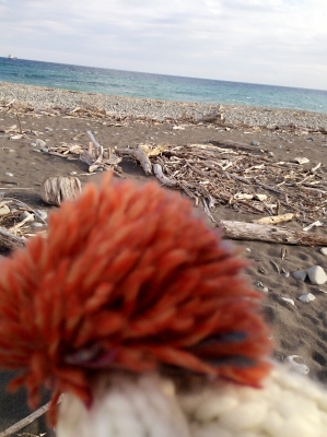彼女の帽子のボンボン越しに見た今日の海。