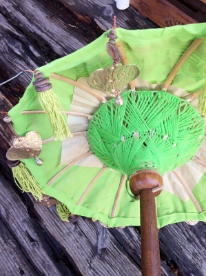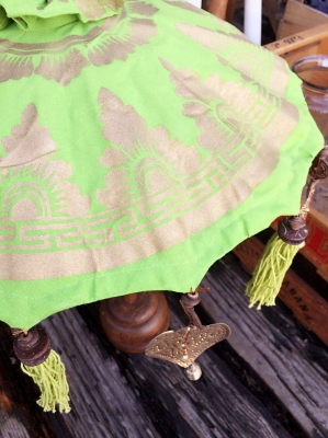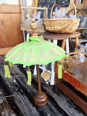 ぶら下がるパーツとゴールドのプリントがリゾート感漂うパラソル。