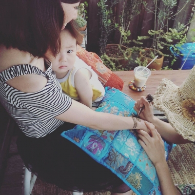 メヘンディを描かれているお母さんに抱っこされて