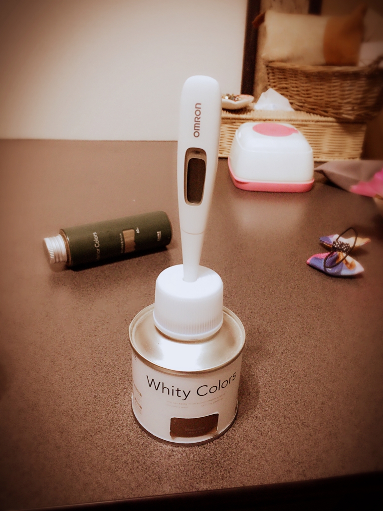 塗料の缶に、オムロン温度計が刺さっている。という