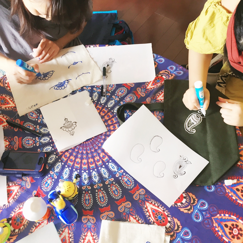 私がいつも使っている布用の塗料で布へ描く練習をした後