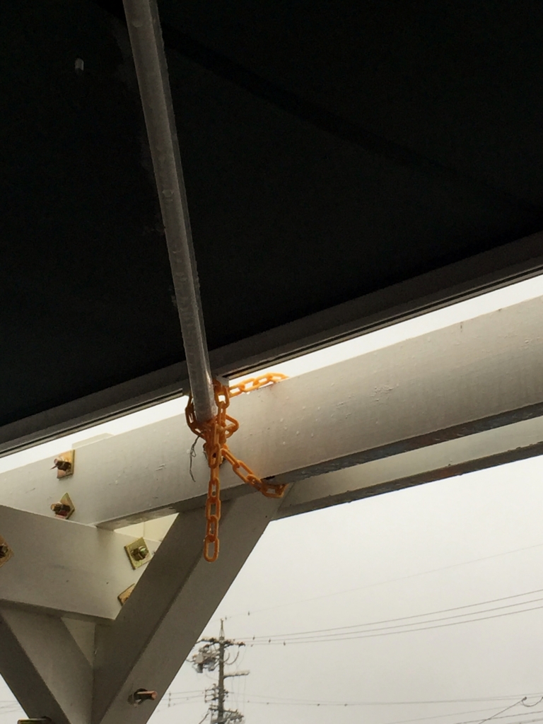 強風で吹っ飛びそうになるんで、黄色チェーンでガッっと固定してます。