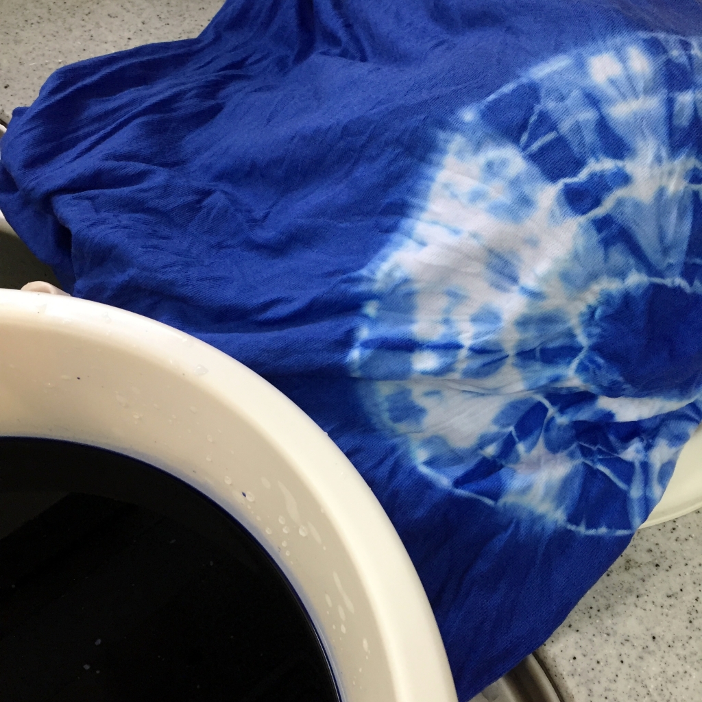 染料の中のTシャツを割り箸で動かしながら染めていると
