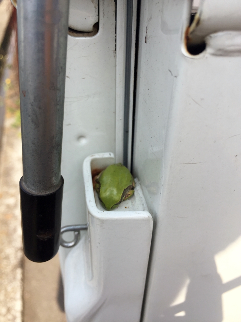 トラックの荷台のフックで日向ぼっこのアマガエル。