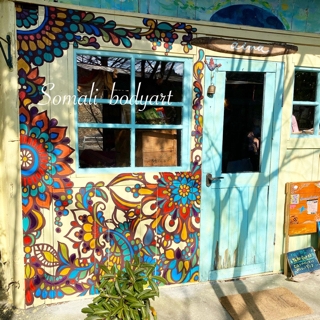 この日はマルシェ。壁絵の続きをしながら、アクセサリー販売とメヘンディ・ジャグアもやります。