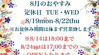 こんにちは。 1つ前の記事で ワークショップやイベントに関してのお知らせをしております。 ぜひご覧下さいませ。 8月のおやすみは ●火曜水曜定休 (お盆期間中は休まず営業しております。) ●お盆期間中14日(水)は18:00までの営業とな...